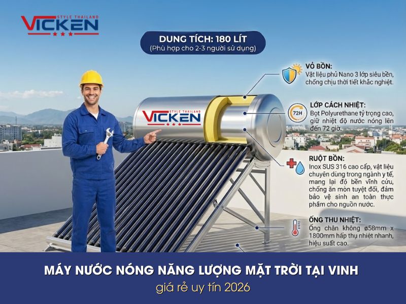 Máy nước nóng năng lượng mặt trời tại Vinh tốt nhất cho năm 2026 là các dòng Vicken Plus Inox 316 (chống ăn mòn, sạch khuẩn) và Vicken ruột PP-R (kháng cặn vôi). Với đặc thù khí hậu gió Lào khô nóng và mùa đông lạnh, máy nước nóng năng lượng mặt trời Vicken với công nghệ giữ nhiệt 96 giờ là lựa chọn số 1 cho các gia đình tại Nghệ An. Giá lắp đặt trọn gói tại Vinh dao động từ 8.500.000 VNĐ đến 12.000.000 VNĐ, cam kết lắp đặt nhanh trong 24h tại TP. Vinh, Thị xã Cửa Lò, Thái Hòa và các huyện phụ cận.